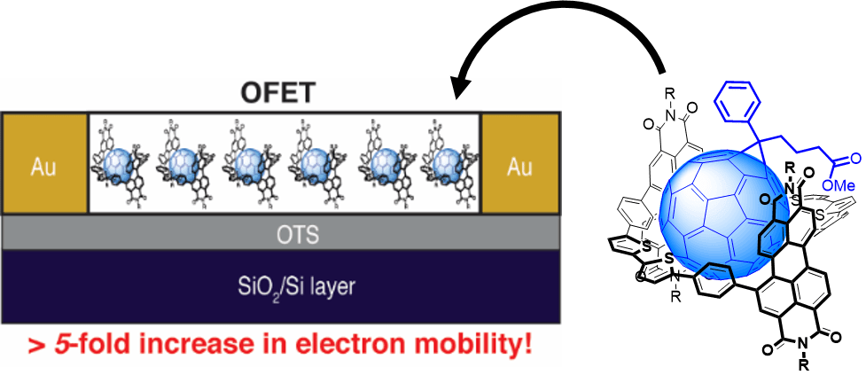 A new macrocycle-fullerene host-guest complex that acts as a superior semiconductor within an organic field effect transistor (OFET) device. This work into new supramolecular assemblies for organic electronic materials was done in collaboration with the group of Prof. C. Nuckolls at Columbia University. Link to paper: https://onlinelibrary.wiley.com/doi/abs/10.1002/chem.202000514