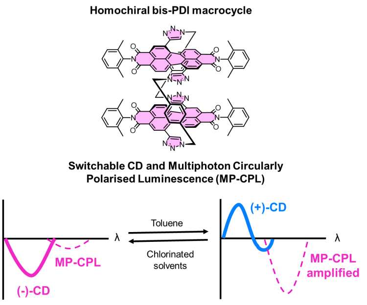 A chiral and configurationally stable bis-perylene diimide macrocycle exhibits switchable circular dichroism and multiphoton circularly polarized luminescence.