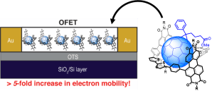 The formation of a macrocycle-fullerene host-guest complex enhances electron mobility in the semiconducting active layer of an organic field effect transistor (OFET).